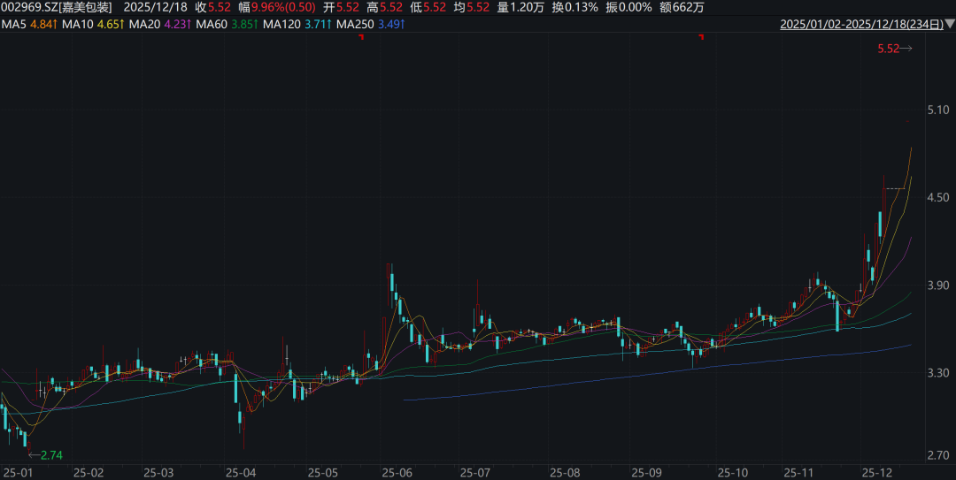 投资时间网、标点财经研究员注意到,此次俞浩入主嘉美包装,引发市场对“智能制造技术赋能传统产线”的预期。停牌前嘉美包装股价已呈上涨趋势,三个交易日累计涨幅超16%。复盘后的12月17日、18日,公司连报两个一字涨停,目前股价报5.52元/股,最新市值来到53亿元。