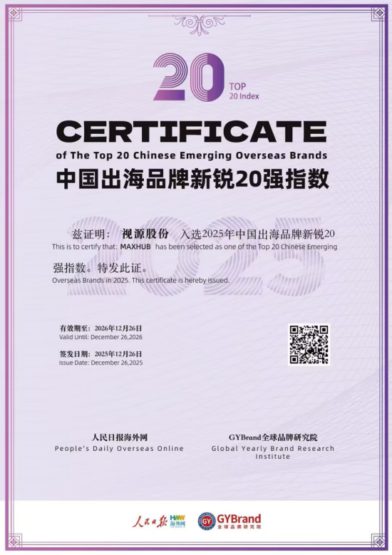 近日,在由人民日报海外网等机构主办的“第三届中国品牌形象海外传播论坛”上,人民日报海外网与GYBrand全球品牌研究院联合编制的“2025年度中国出海品牌新锐20强指数”正式发布,视源股份(002841)凭借其在海外市场的扎实表现与持续提升的品牌影响力成功入选,展现了公司在品牌国际化征程中的强劲势头与创新活力。