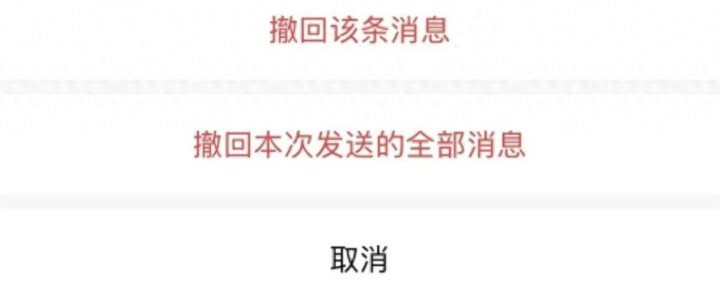 其中「撤回该条消息」就是撤回长按的这条消息,而「撤回本次发送的全部消息」则是撤回两分钟内发送的全部消息。